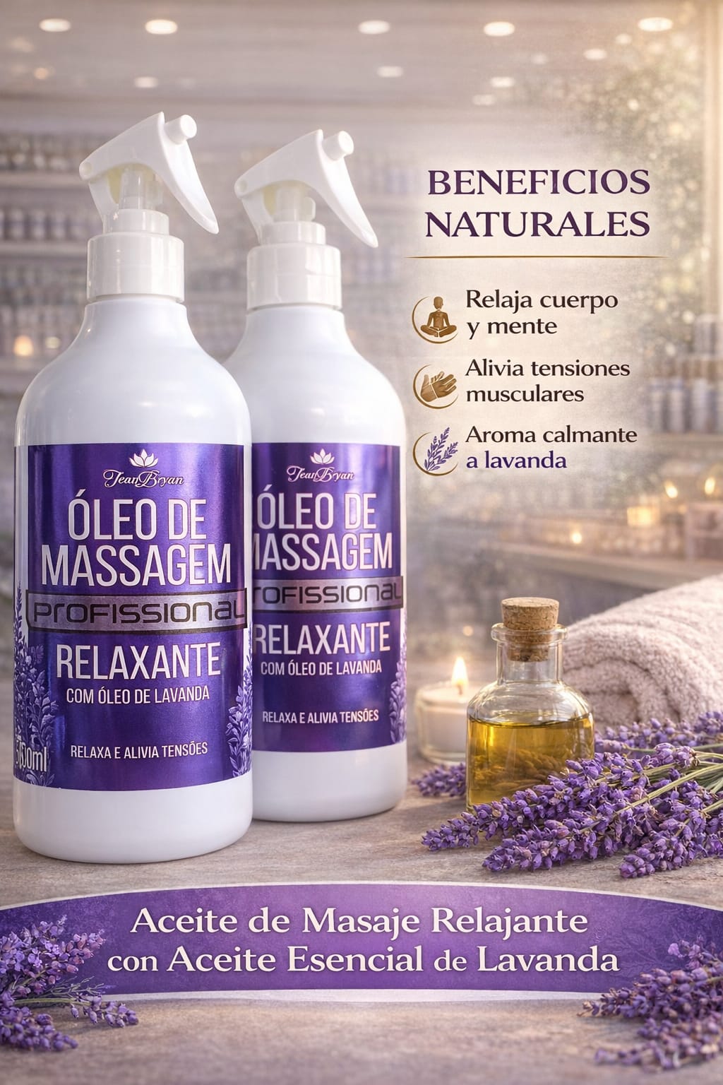 Enriquecido con aceite esencial de lavanda, reconocido por sus propiedades calmantes y aromáticas, este aceite ayuda a relajar músculos cansados, aliviar el estrés diario y promover una sensación de tranquilidad tanto en el cuerpo como en la mente.