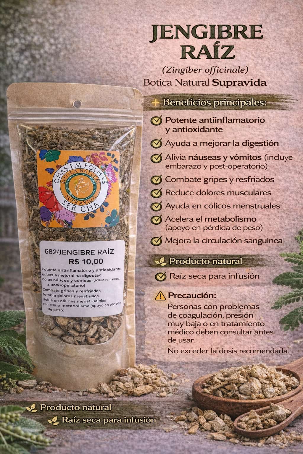 El jengibre es una raíz milenaria reconocida por sus propiedades antiinflamatorias, digestivas y estimulantes naturales. Rico en gingeroles y compuestos antioxidantes, es un gran aliado para el bienestar general.