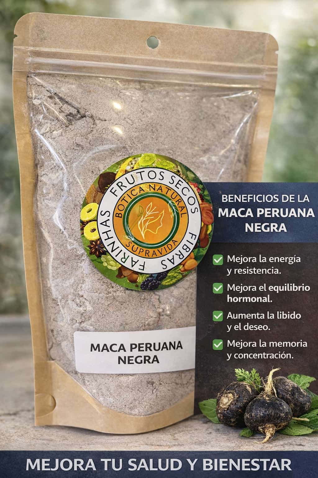 La maca negra es una de las variedades más potentes de maca. Tradicionalmente utilizada en los Andes peruanos, es conocida por su efecto revitalizante y adaptógeno.