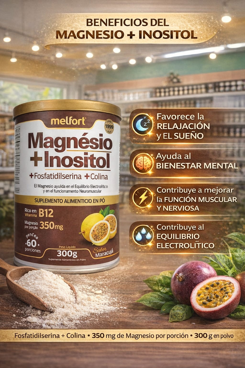 El Magnesio + Inositol Melfort es un suplemento completo que ayuda a apoyar el sistema nervioso, favorecer la relajación y mejorar el bienestar mental.