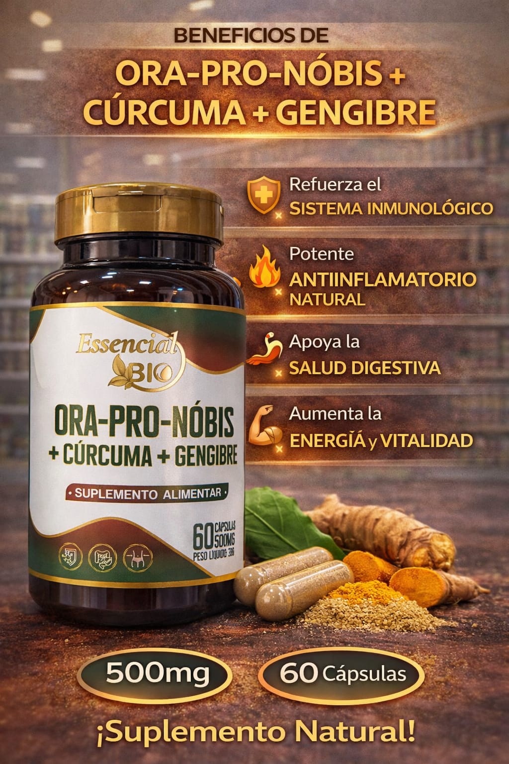 El suplemento Ora-Pro-Nóbis con Cúrcuma y Jengibre combina tres ingredientes naturales reconocidos por sus propiedades nutricionales y beneficios para la salud. Esta poderosa combinación ayuda a fortalecer el sistema inmunológico, apoyar la salud digestiva y promover el bienestar general del organismo.