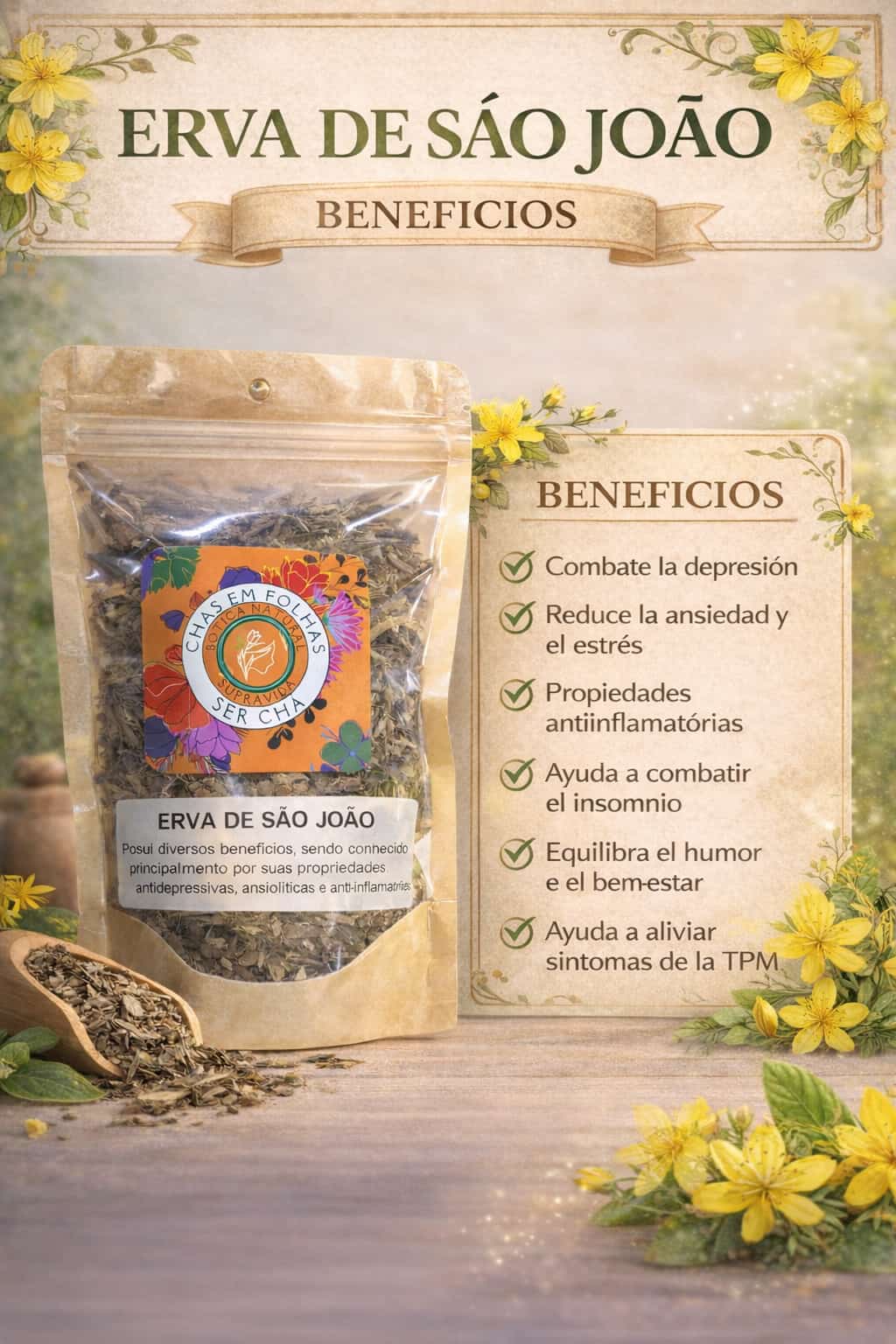El Té de Erva de São João, también conocida como Hierba de San Juan, es una infusión tradicionalmente utilizada por sus propiedades que favorecen el equilibrio emocional y el bienestar general.