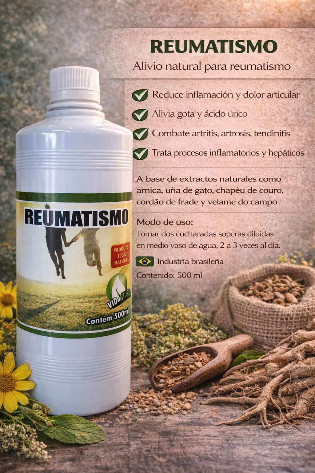Producto 100% natural, formulado con extractos vegetales tradicionalmente utilizados para ayudar a aliviar dolores articulares, reducir la inflamación y mejorar la movilidad, siendo un apoyo natural en casos de reumatismo.